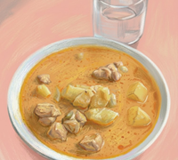 肉、玉ねぎ、芋、ミルク、水、ターメリック、カレーパウダー